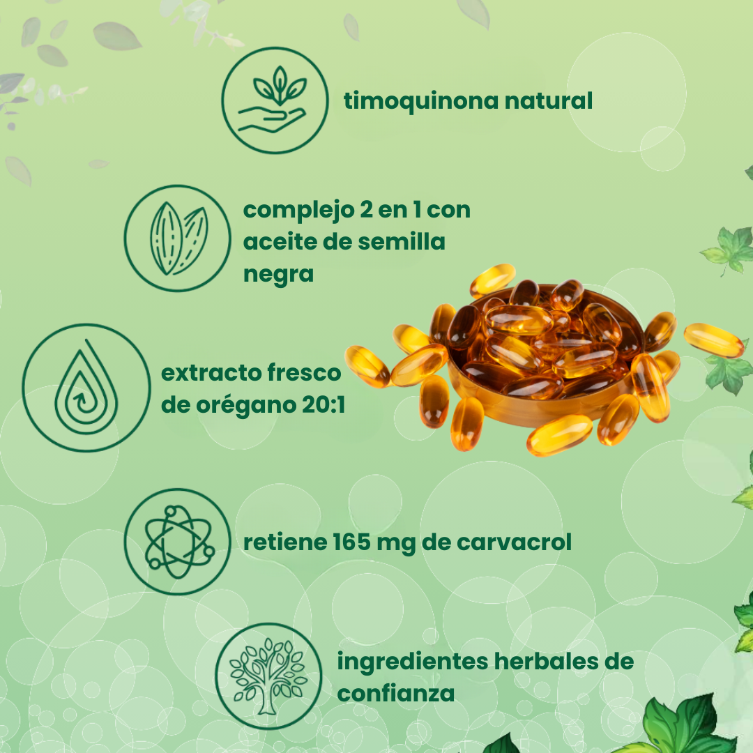 Aprovecha el poder del aceite de orégano y el aceite de comino negro en una sola cápsula diaria.